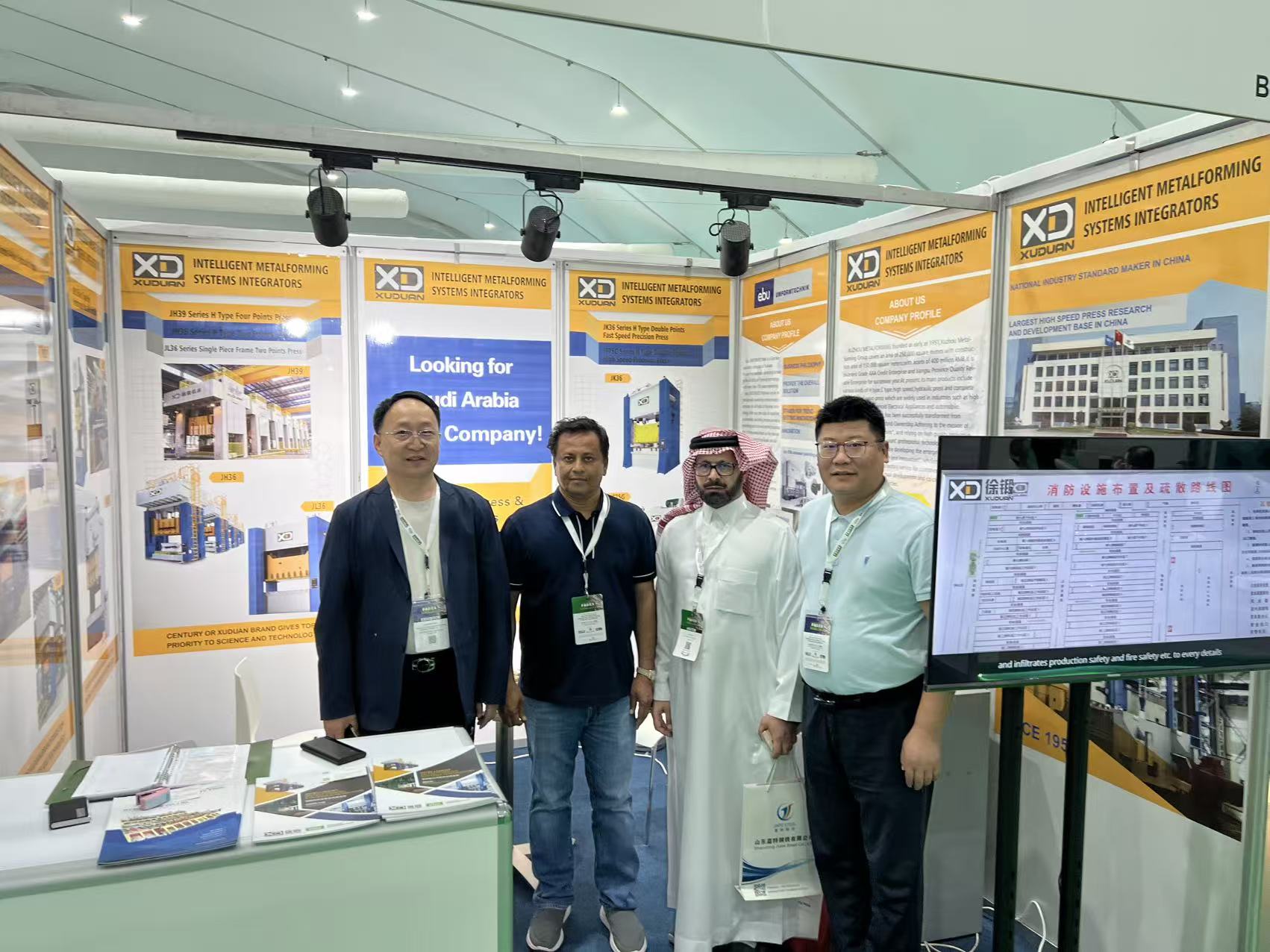 具体对接中,李伟副总聚焦产品与技术讲解,向来自全球各地的专业买家、行业专家详细介绍徐锻公司的发展实力与核心竞争力。他重点展示了徐锻在锻压机械领域的创新成果——伺服热成形冲床、智能化金属成型生产线等明星产品,并结合实际应用场景,阐述产品在性能稳定性、生产效率提升等方面的优势。这些契合中东市场需求的高品质设备,成功吸引了沙特本土及周边国家客户的广泛关注,不少客户驻足展位,就产品细节与应用可能性展开深入咨询。