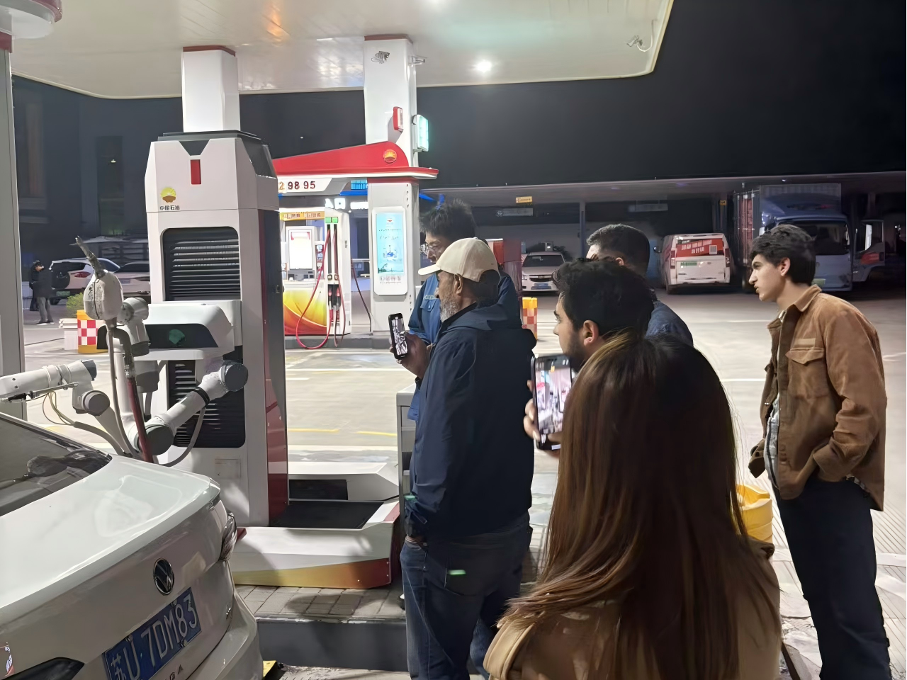 当日晚间,俄方代表团在富仁高科带领下赴苏州昆山加油站实地考察,近距离观摩设备“智能识别车辆→精准定位油枪→自动加注→无感结算”的完整工作状态。其操作逻辑流畅、作业高效、设计安全,引得俄方成员驻足询问、拍照记录。实地考察展现了富仁高科加油机器人技术优势与实用价值,为后续采购与合作提供支撑。