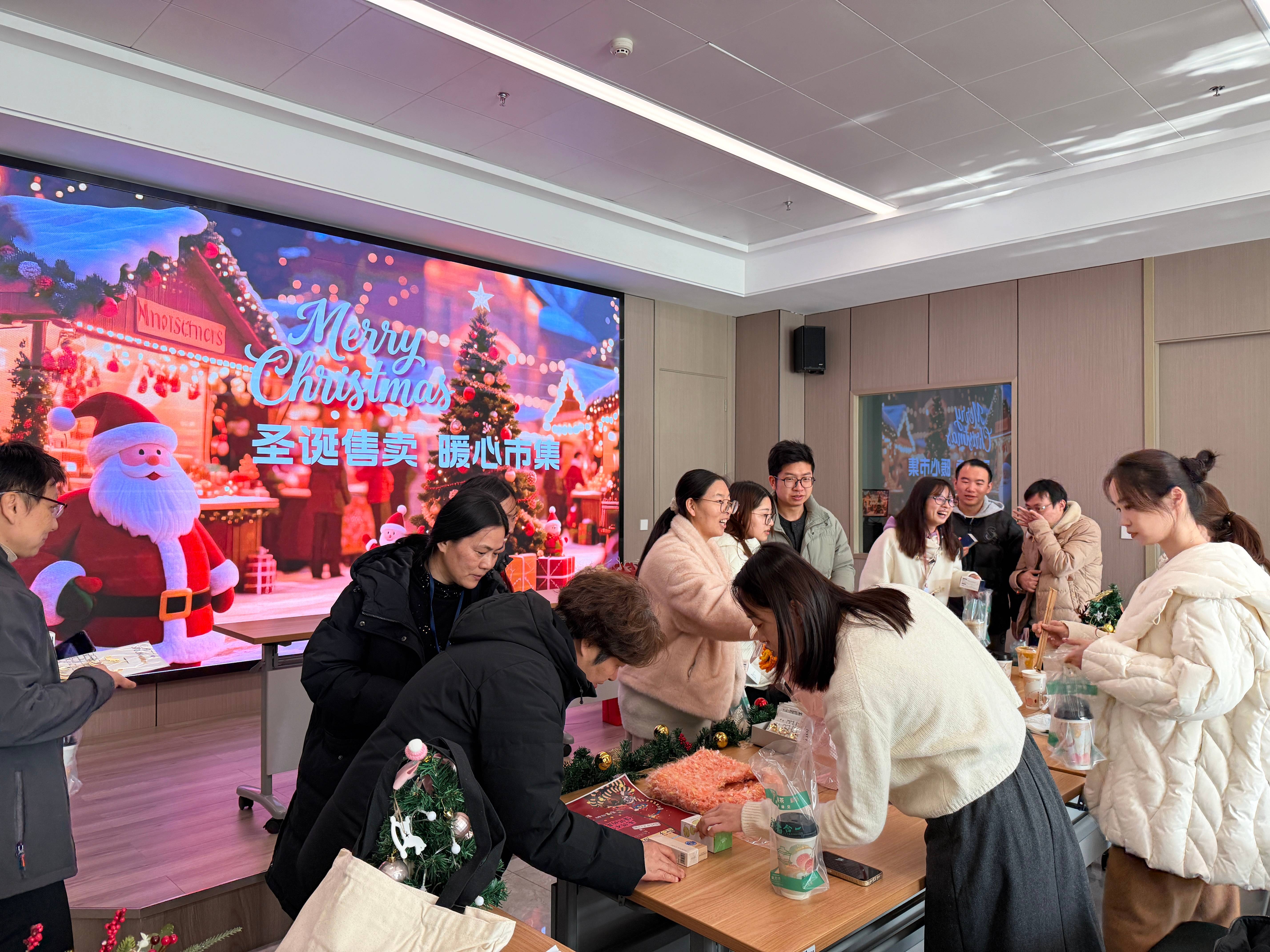 线下暖心市集上,集团总部及各子公司筹备的10个特色摊位整齐陈列,商品种类丰富多元。食品区有氛围感浓郁的圣诞主题蛋糕、有香气扑鼻的暖手奶茶、有种类丰富的水果拼盘,满足不同味蕾需求;文创区有手工自制的精美挂饰、桌面摆件等作品巧思满满,尽显员工才艺;闲置区有各色物品或置换或低价转让,在盘活资源的同时,也让好物延续了温暖与价值。活动中,员工们三五结伴穿梭摊位,挑选心仪好物、与跨部门及子公司同事热切交流,在轻松氛围中拉近了距离,让培训室成为传递温暖与情谊的纽带。