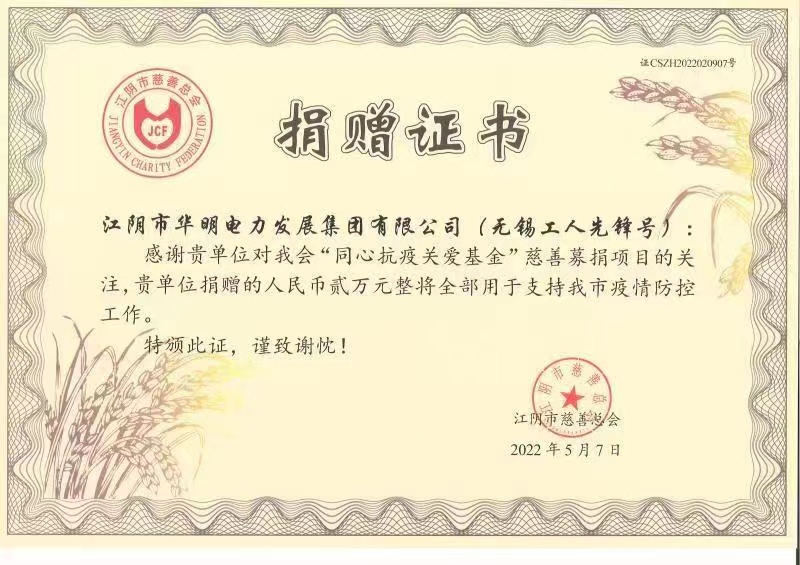 5月6日,富仁集团子公司华明电力向江阴市慈善总会捐赠抗疫基金2万元,资助福利院1万元,在我市疫情预警拉响最高警戒的时刻,以实际行动诠释企业担当力量。