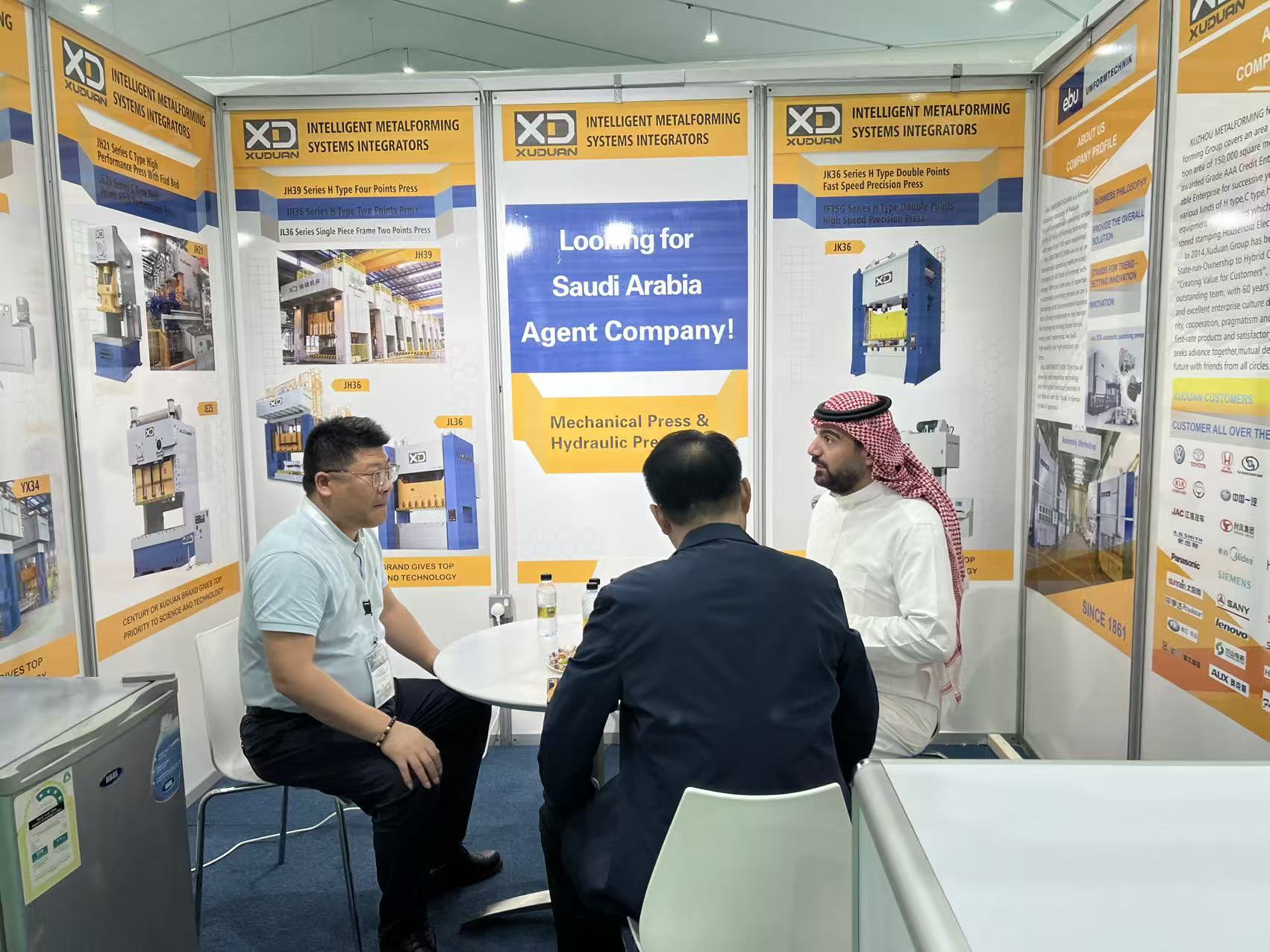 具体对接中,李伟副总聚焦产品与技术讲解,向来自全球各地的专业买家、行业专家详细介绍徐锻公司的发展实力与核心竞争力。他重点展示了徐锻在锻压机械领域的创新成果——伺服热成形冲床、智能化金属成型生产线等明星产品,并结合实际应用场景,阐述产品在性能稳定性、生产效率提升等方面的优势。这些契合中东市场需求的高品质设备,成功吸引了沙特本土及周边国家客户的广泛关注,不少客户驻足展位,就产品细节与应用可能性展开深入咨询。